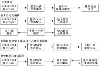 4. 特殊分機房號編碼:在主機按“0000+2004+ 分機原始房號+自定義特殊房號”設置完第一個房號后,主機顯示"INPU”后,進入下一個分機房號編碼。輸入“分機原始房號-自定特殊房號”依次設置即可. 設置完成后在主機“中” 鍵退出,設置完成