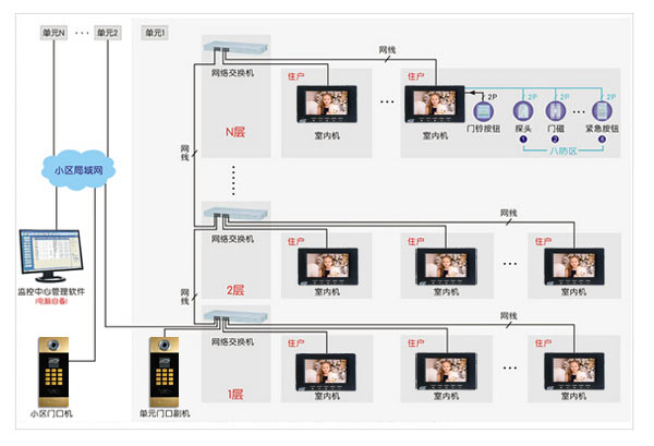 3.若正常工作說明門口主機及線路和設備是正常的;接著切斷系統電源,再連接好上一層系統的主線路,進行第二層調試(系統接線時一定要斷電),依次往上調。